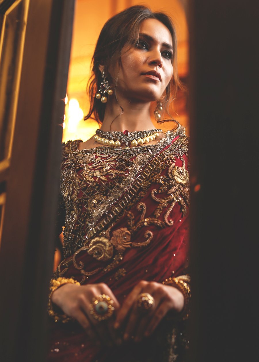 The new bridal collection is geared up with fantastic deep red embroidered Pakistani bridal lehnga outfit to adorn your special unique look.